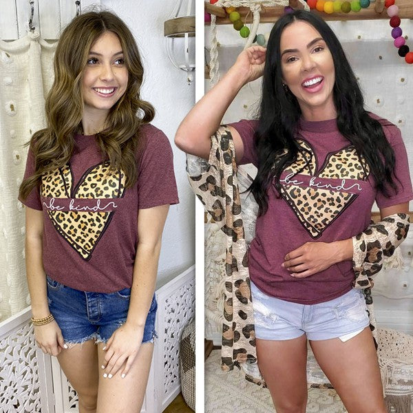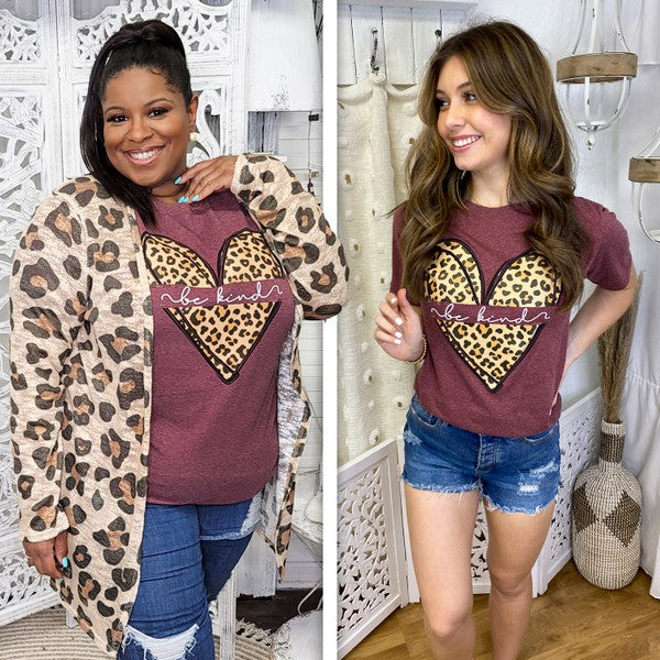 -Design features the top and bottom sections of a heart printed in leopard design, with be kind printed in the center with white ink.