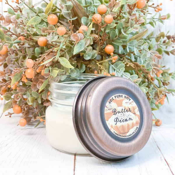 Our 4 oz mason jar soy candles add a fresh farmhouse feel to any room. This soy candle features a vintage style copper or pewter lid.